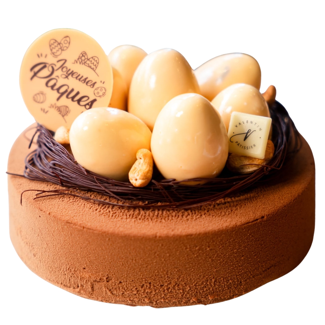Croustillant noix de cajou, biscuit cuillère chocolat, crémeux noix de cajou, caramel fruit de la passion, mousse Manjari 64%, ganache montée vanille bio de Madagascar, praliné noix de cajou.