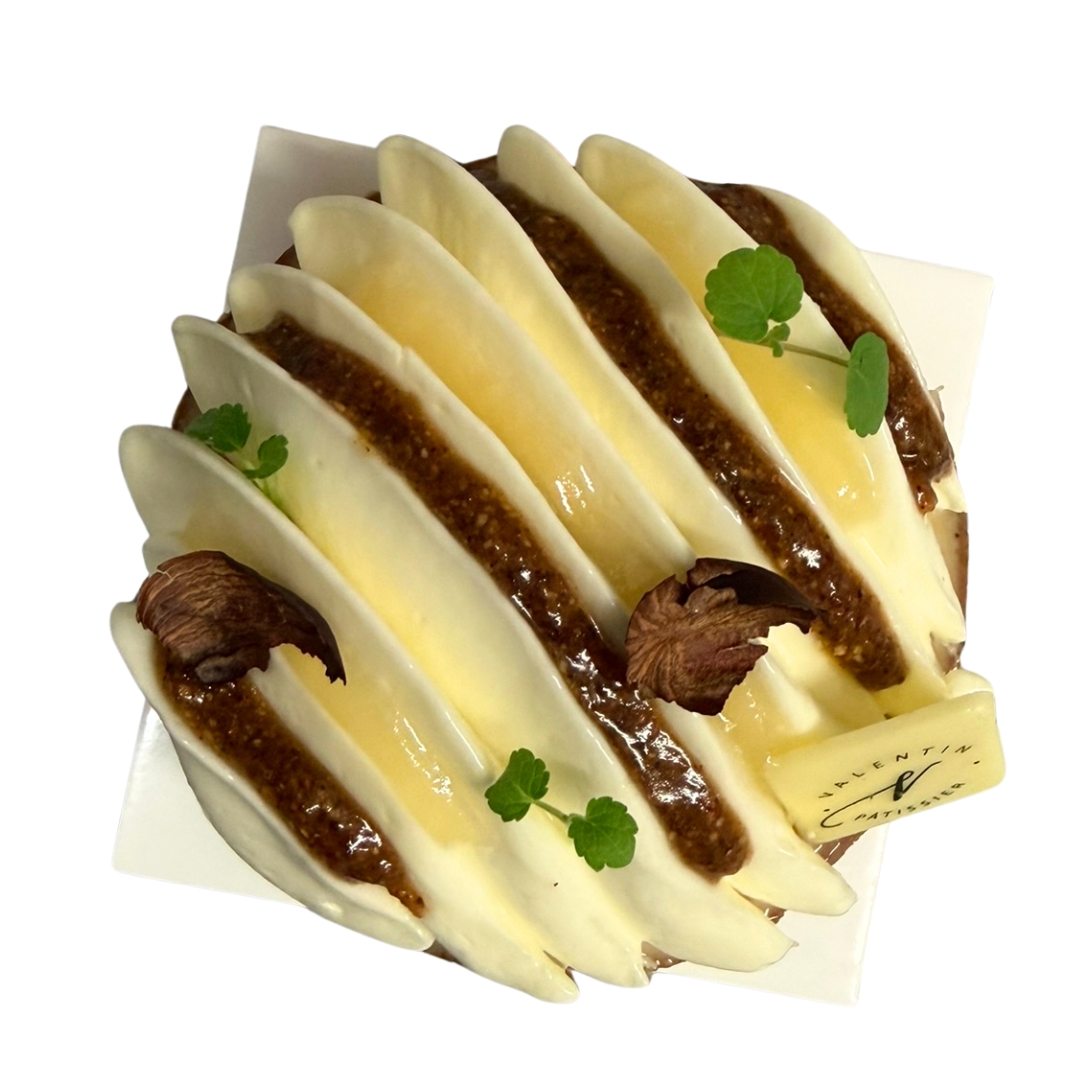 Pâte sucrée noisette, crème de noisette, crémeux mascarpone noisette, ganache montée citron vert et yuzu, confit citron vert, praliné noisette sarrasin.