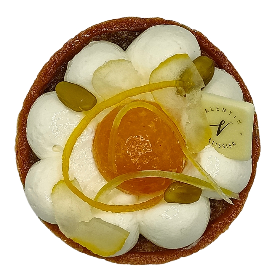 Pâte sucrée amande, crème amande, praliné pistache, marmelade d’agrumes, ganache montée fleur d’oranger, agrumes confits.